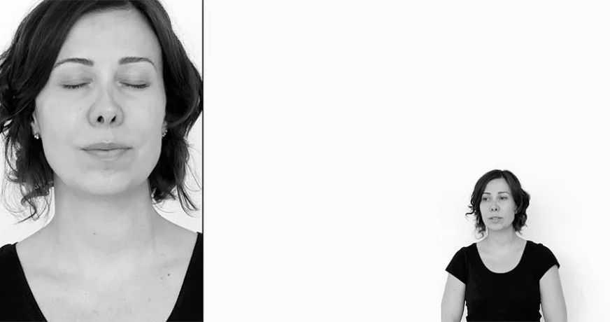 Ao lado da tela de exibição do vídeo, um autoretrato impresso da artista é fixado diretamente sobre a parede, contendo o mesmo pedaço de espelho colado que sobrepõe seu olhar. Assim, os olhos do espectador estarão refletidos no lugar dos olhos dela.